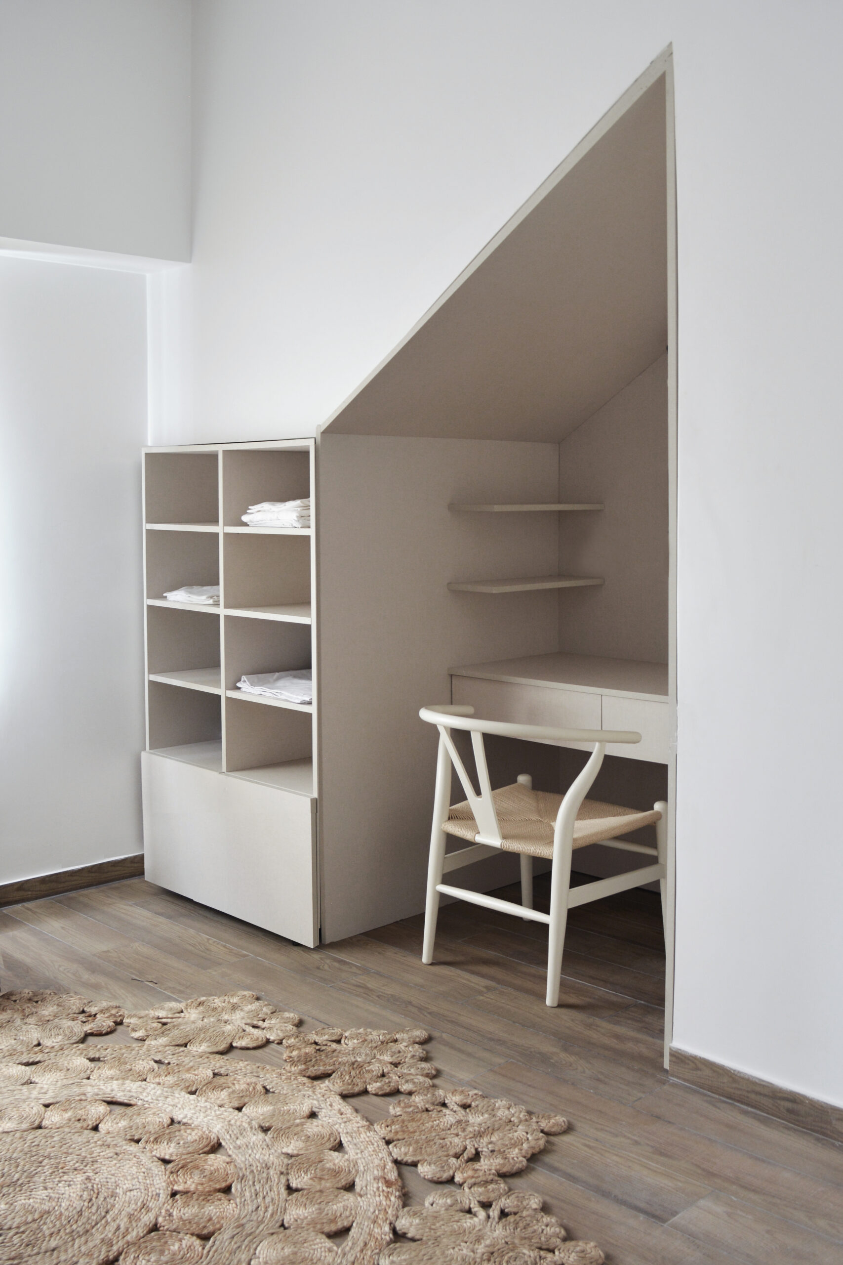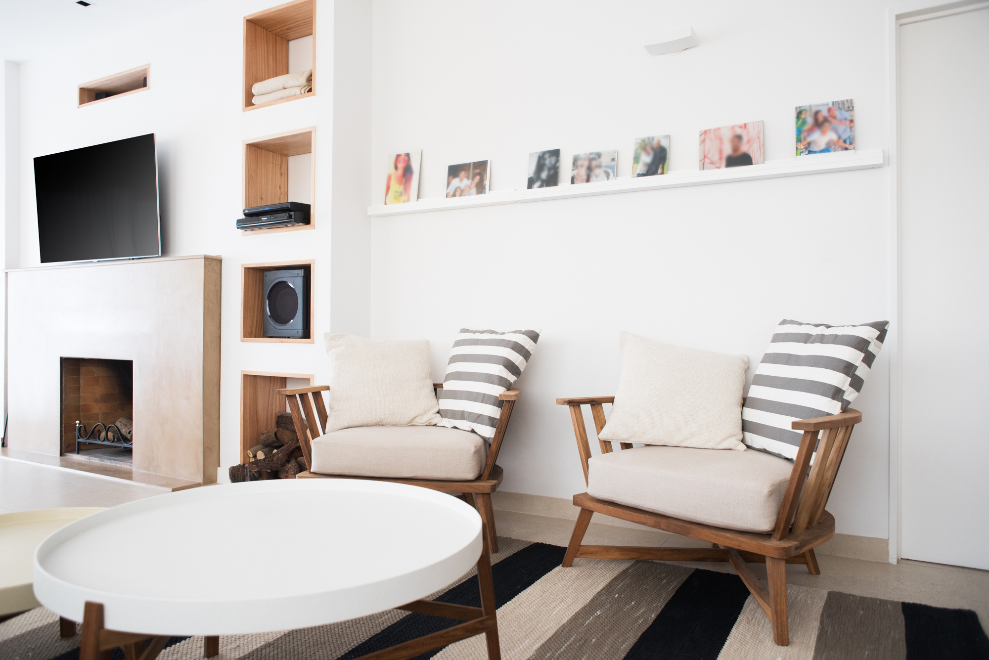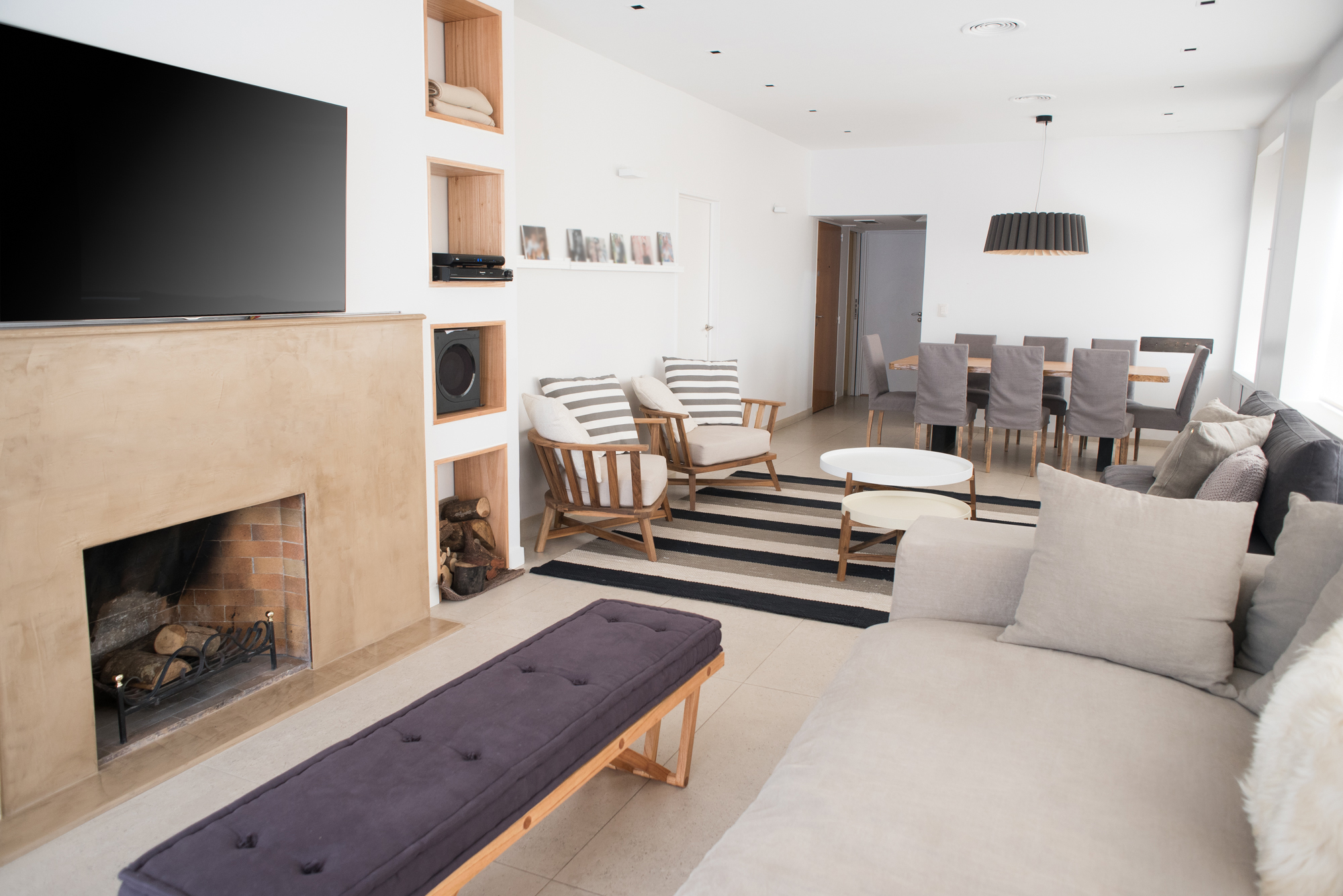 En el dormitorio principal se incorporó un ambiente para poder armar un vestidor con escritorio y se desmontó un gran jacuzzi que estaba en desuso para armar un espacio de tocador. En el living y comedor alargado se proyectó un sector de televisión, un sector de reunión y otro destinado al comedor. El desafío era poder armar en este rectángulo con salida a la terraza sectores que no generen un pasillo. Para esto se decidió invertir el sector de la televisión dejándolo próximo a la terraza. Se instaló el televisor arriba de la chimenea existente, la cual se revistió con microcemento, y se armó con durlock una estructura con nichos para poder usar de apoyo. En los tres sectores se usaron distintos tonos de maderas naturales y macizas combinados con linos en colores grises y crudos.